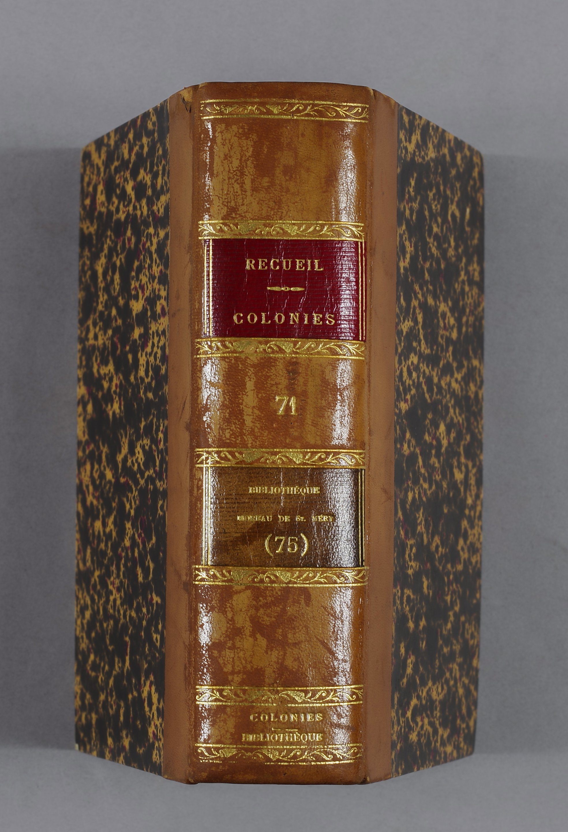 Formée de 275 volumes, la bibliothèque Moreau de Saint-Méry rassemble près de 3 000 livres, factums et libellés, textes législatifs et journaux concernant essentiellement les colonies françaises, en particulier Saint-Domingue, la Martinique et la Guadeloupe. Cet ensemble est exceptionnel par ses thématiques principales. Il se compose d’imprimés à caractère politique, philosophique ou juridique de la période de la Révolution et de l’Empire, centrés sur les problèmes coloniaux : liberté du commerce, esclavage et traite des noirs, égalité des droits des gens de couleur libres, événements militaires aux Antilles...