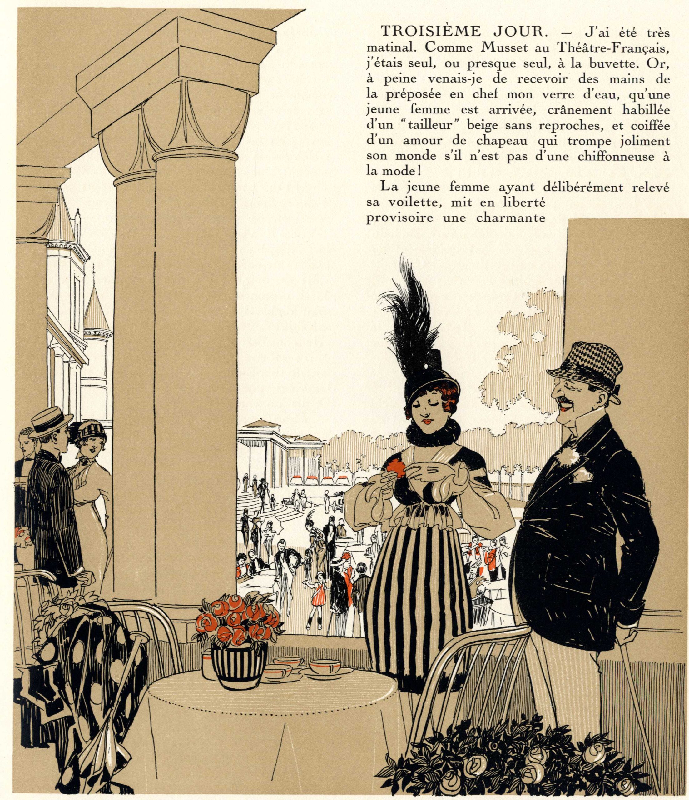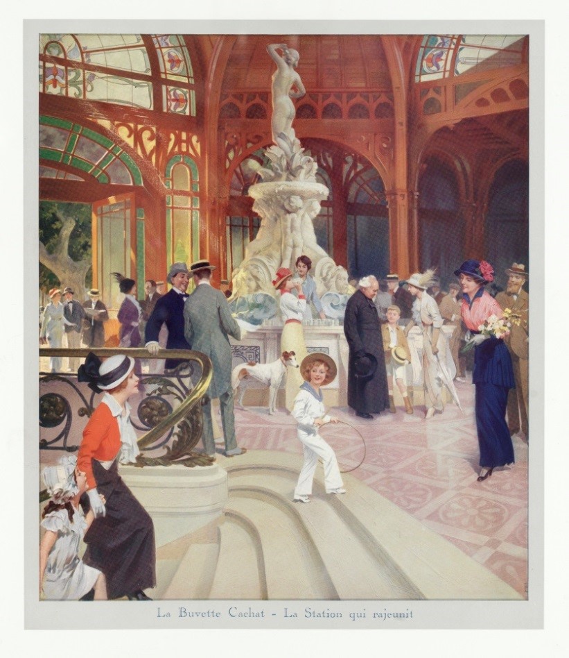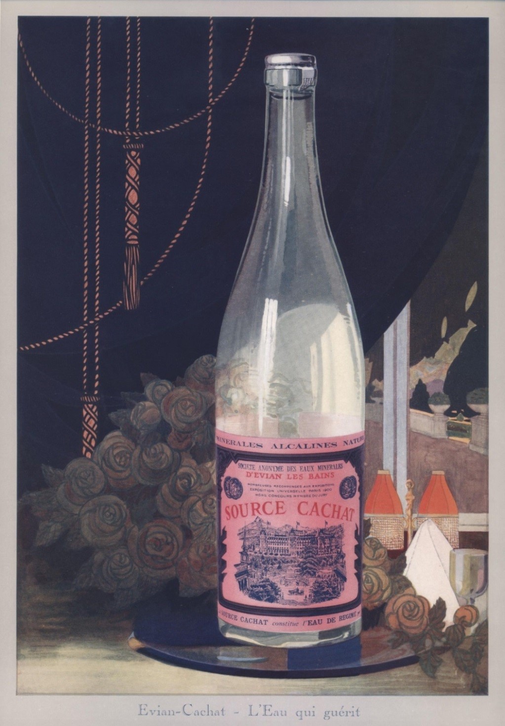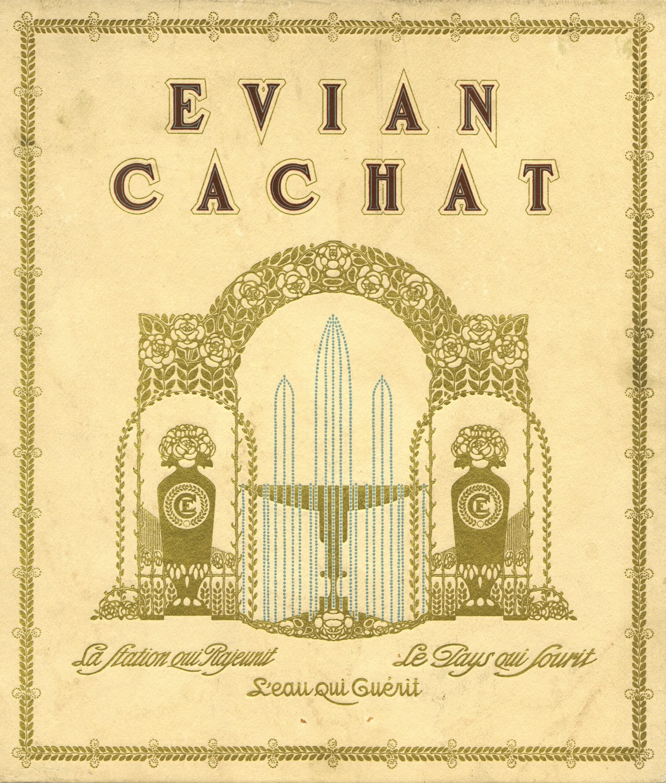 En 1825, le petit établissement ouvert par Gabriel Cachat est acheté par François Fauconnet, qui créé la Société anonyme des eaux minérales d’Évian. Cette dernière confie en 1914 la réalisation d’un ouvrage publicitaire à l’imprimerie d’art Chez Draeger, spécialisée dans l’imprimerie typographique, lithographique et la technique de la taille-douce. L’ouvrage est pensé comme un livre d’art, dont le lettrage et les éléments décoratifs sont dessinés avec raffinement. En plus d’un traitement esthétique remarquable, se déploie dans l’ouvrage une stratégie publicitaire bien menée : récits, témoignages, documents, photographies, illustrations et reproductions d’œuvres se succèdent.