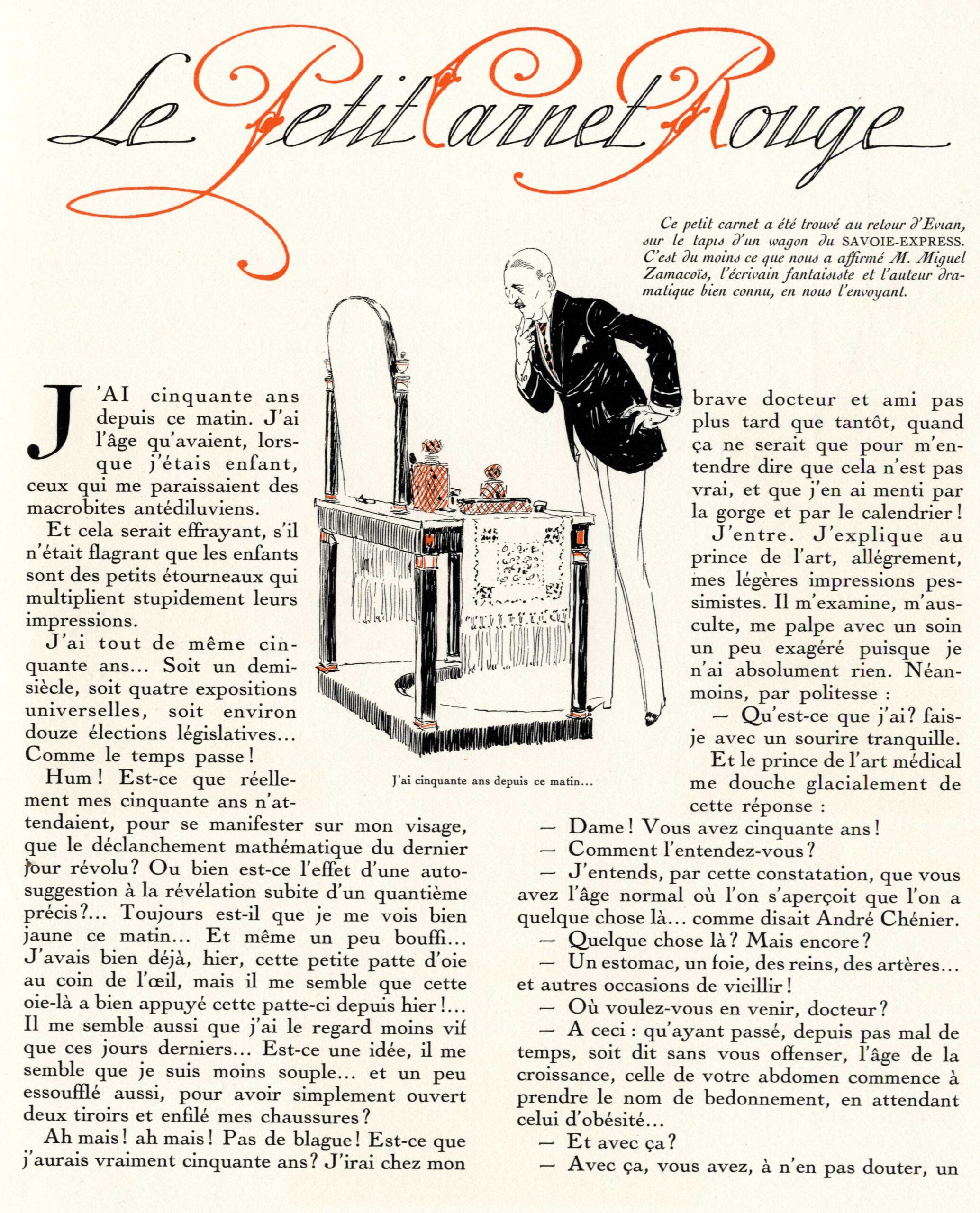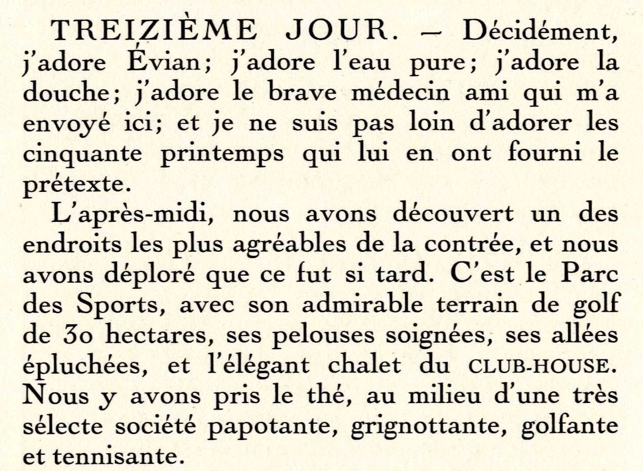 Une carte touristique et des photographies promeuvent la situation géographique de la station et de ses hôtels de luxe. Il s’ensuit un texte, narrant le séjour d’un curiste, écrit par Miguel Zamacoïs et inspiré par les notes d’un carnet trouvé dans le Savoie-express. Le texte raconte la rencontre entre deux curistes, qui partent à la découverte de la station thermale et de ses alentours. La publication se clôt sur les recommandations du docteur François Helme qui invite le lecteur à suivre une cure dans cette station d’Évian pour ses vertus thérapeutiques et son climat apaisant.