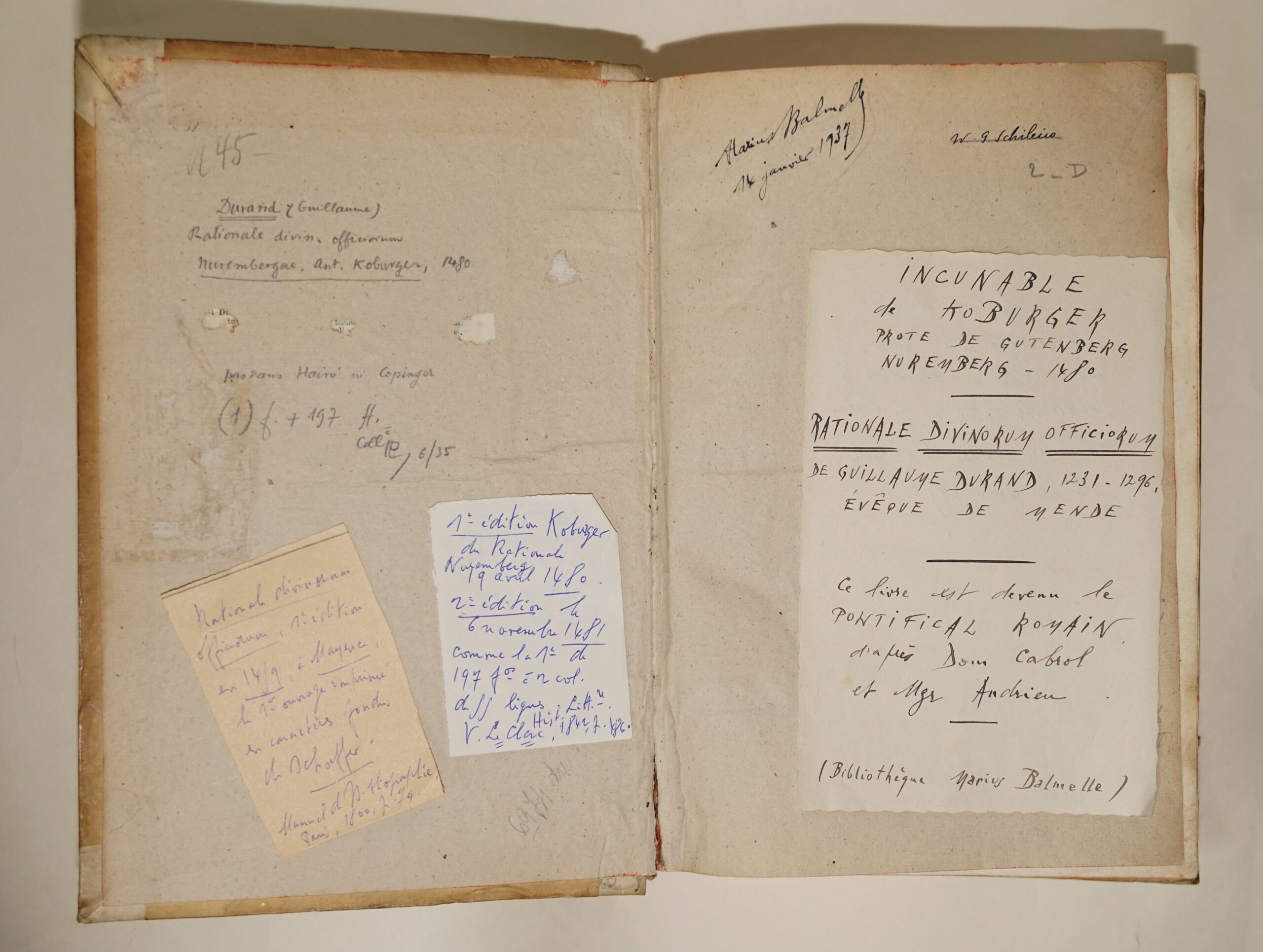Parmi eux, conservé précieusement dans un coffre à la banque… un incunable. Il s’agit du Rationale divinorum officiorum de Guillaume Durand, évêque de Mende (v.1230-1296). C’est une édition de 1480 (imprimée à Nuremberg chez Anton Koberger), qu’il aurait acquise le 14 janvier 1937. Deuxième incunable des Archives départementales de la Lozère, ce traité est considéré comme l’un des plus importants écrits médiévaux dans le domaine de la liturgie. Marius Balmelle y a laissé des fiches de notes à l’intérieur, avec des informations sur les éditions et l’acquisition de cet ouvrage.