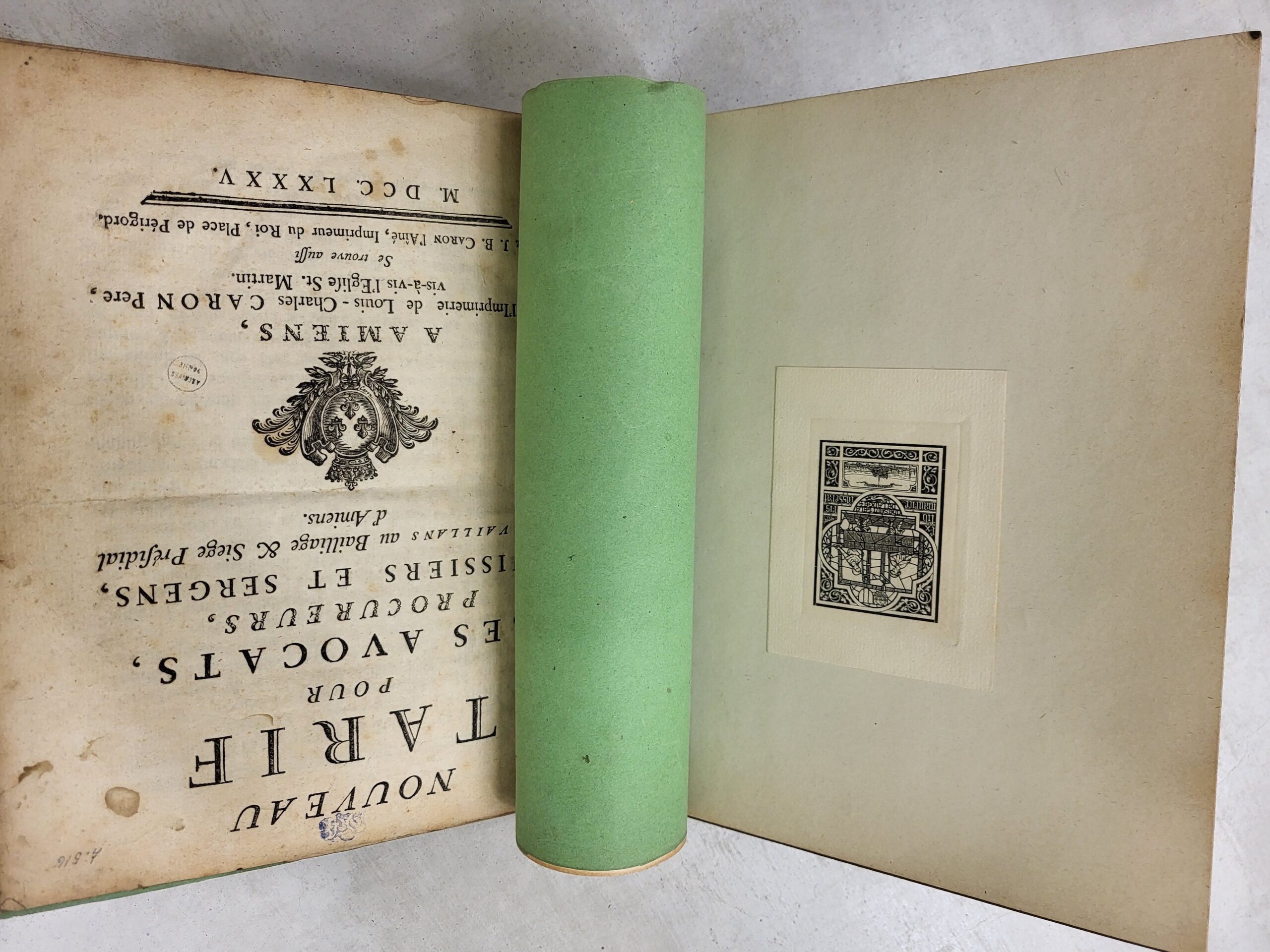 L’ex-libris est composé d’une vue d’Amiens avec des tisserands au travail, et la devise Che sent tele de lange (en picard, « ce sont telliers de linge » ou « ce sont des tisserands de laine »), qui rappellent naturellement les activités textiles de la famille Cosserat en même temps que son goût pour l’histoire d’Amiens.