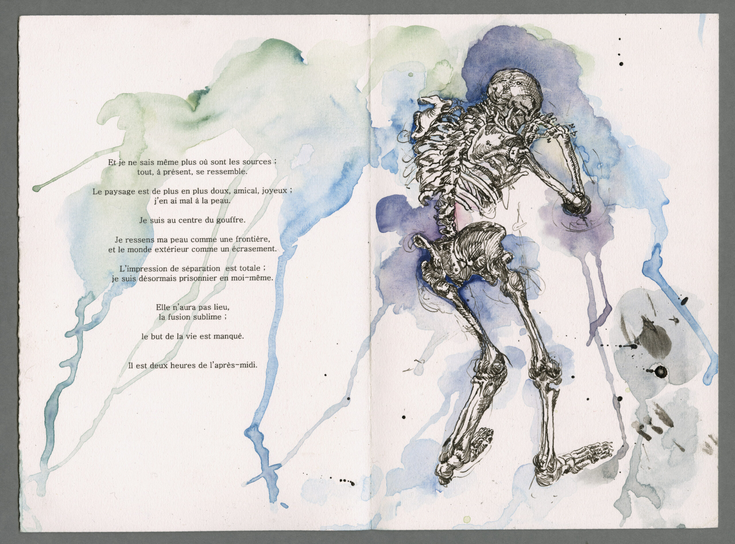 Cette œuvre publiée en 2013 a été composée par Michel Houellebecq, d’après son roman, Extension du domaine de la lutte, où le narrateur choisi l’isolement et passe quelques jours proche des sources de l’Ardèche. L’illustratrice a choisi de représenter la rivière Ardèche, qui descend de la montagne ardéchoise jusqu’au Rhône.
