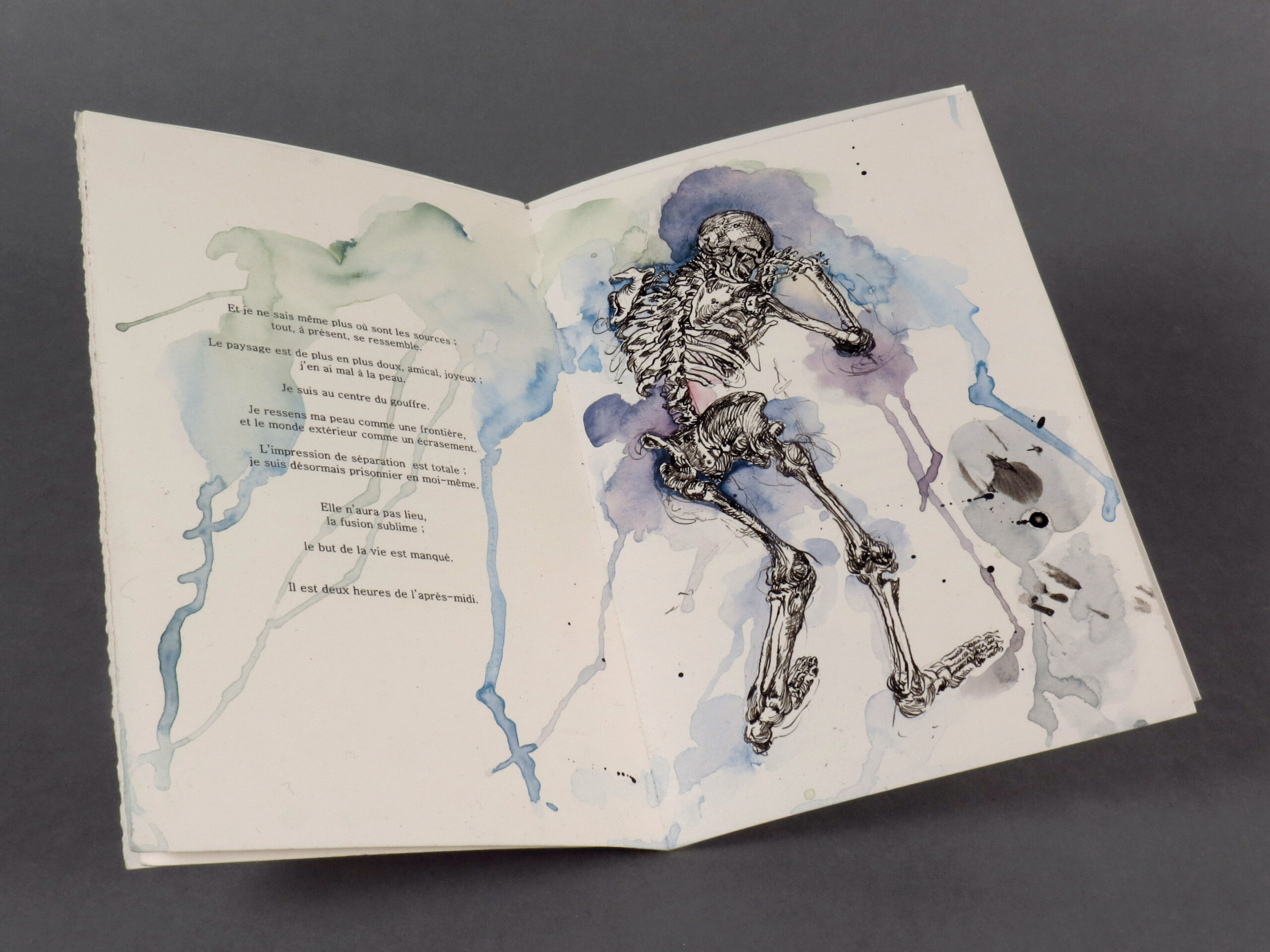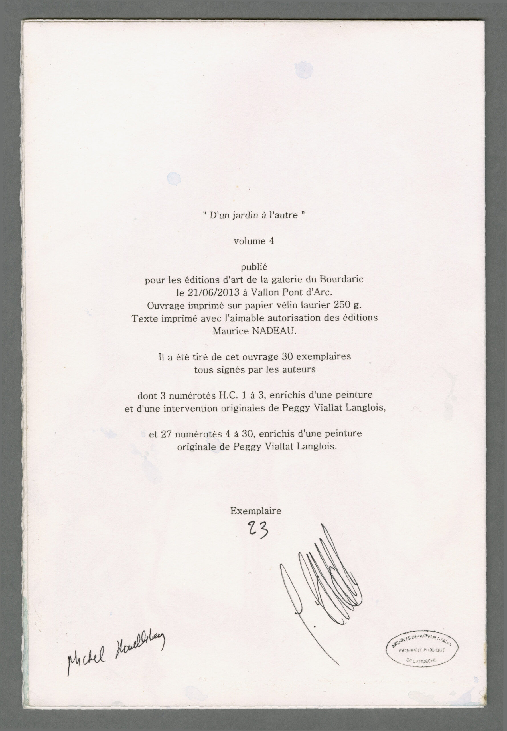 Numérotée exemplaire numéro 23 sur 30, signée par les auteurs, elle contient une peinture aquarelle originale de l’artiste Peggy Villat Langlois, en pleine double page. Imprimé sur du papier vélin laurier 250 g., l’ouvrage de 28×19 cm n’est pas relié. Il est inséré dans une pochette en plexiglass. Trois photographies de l’auteur sont jointes.
