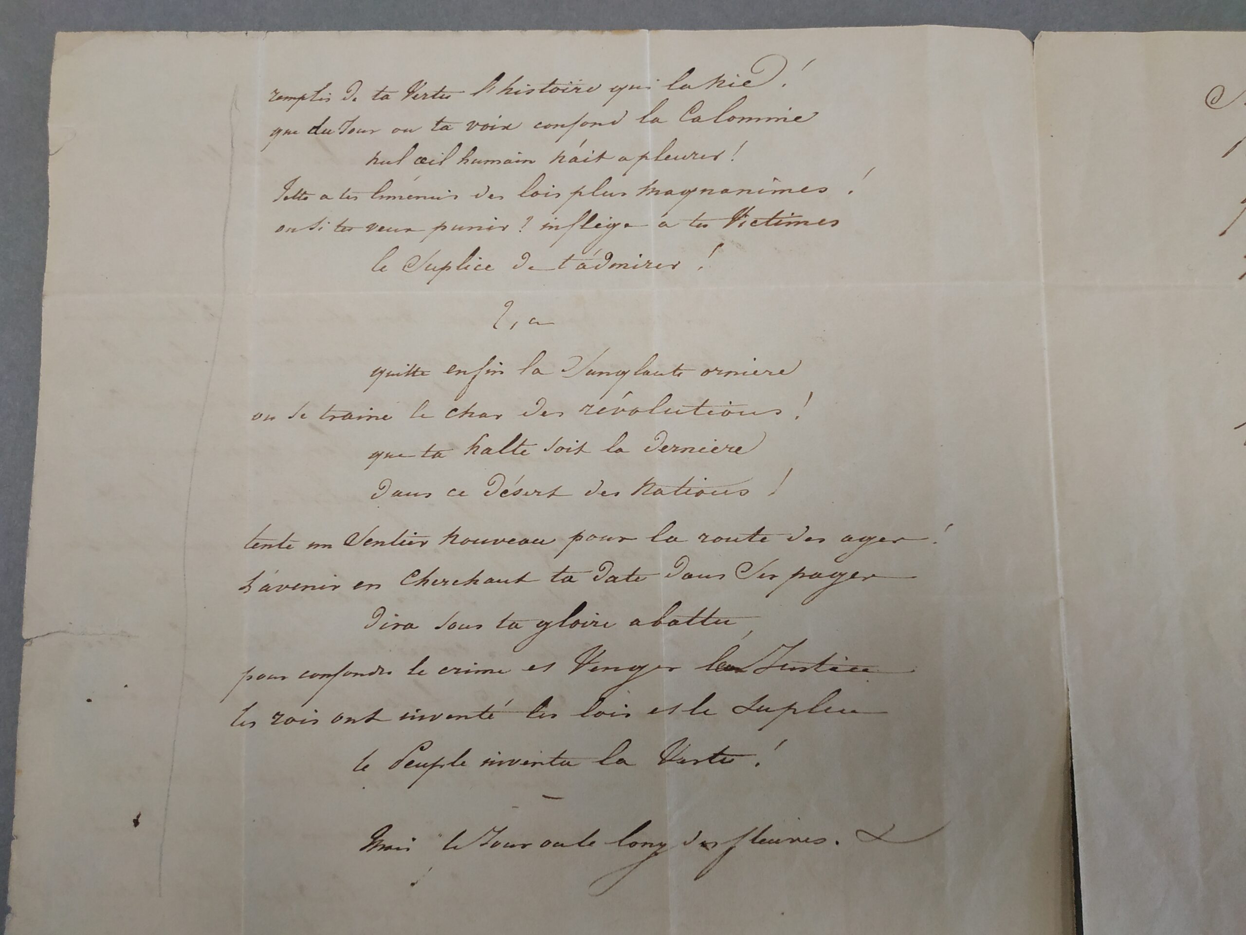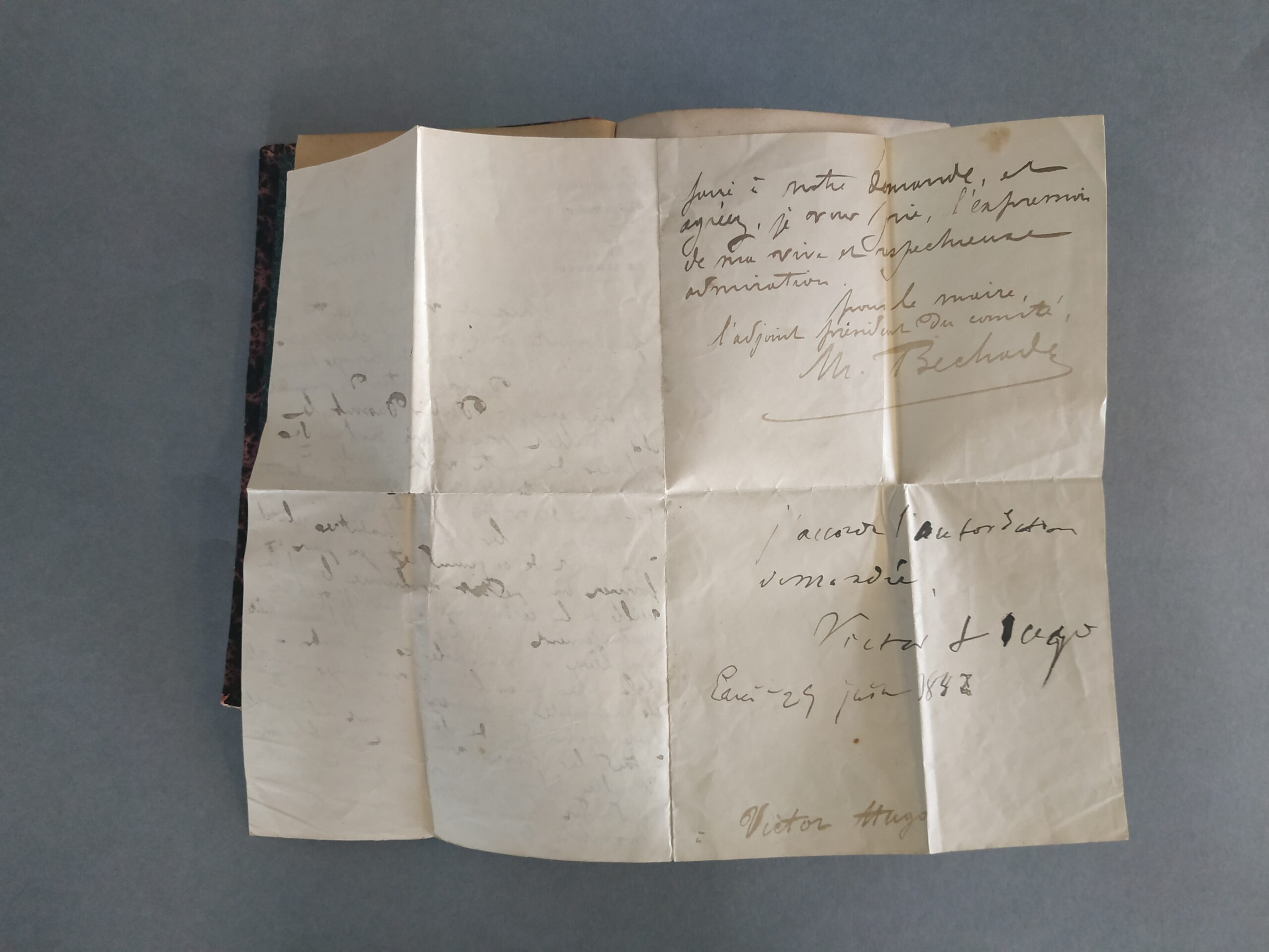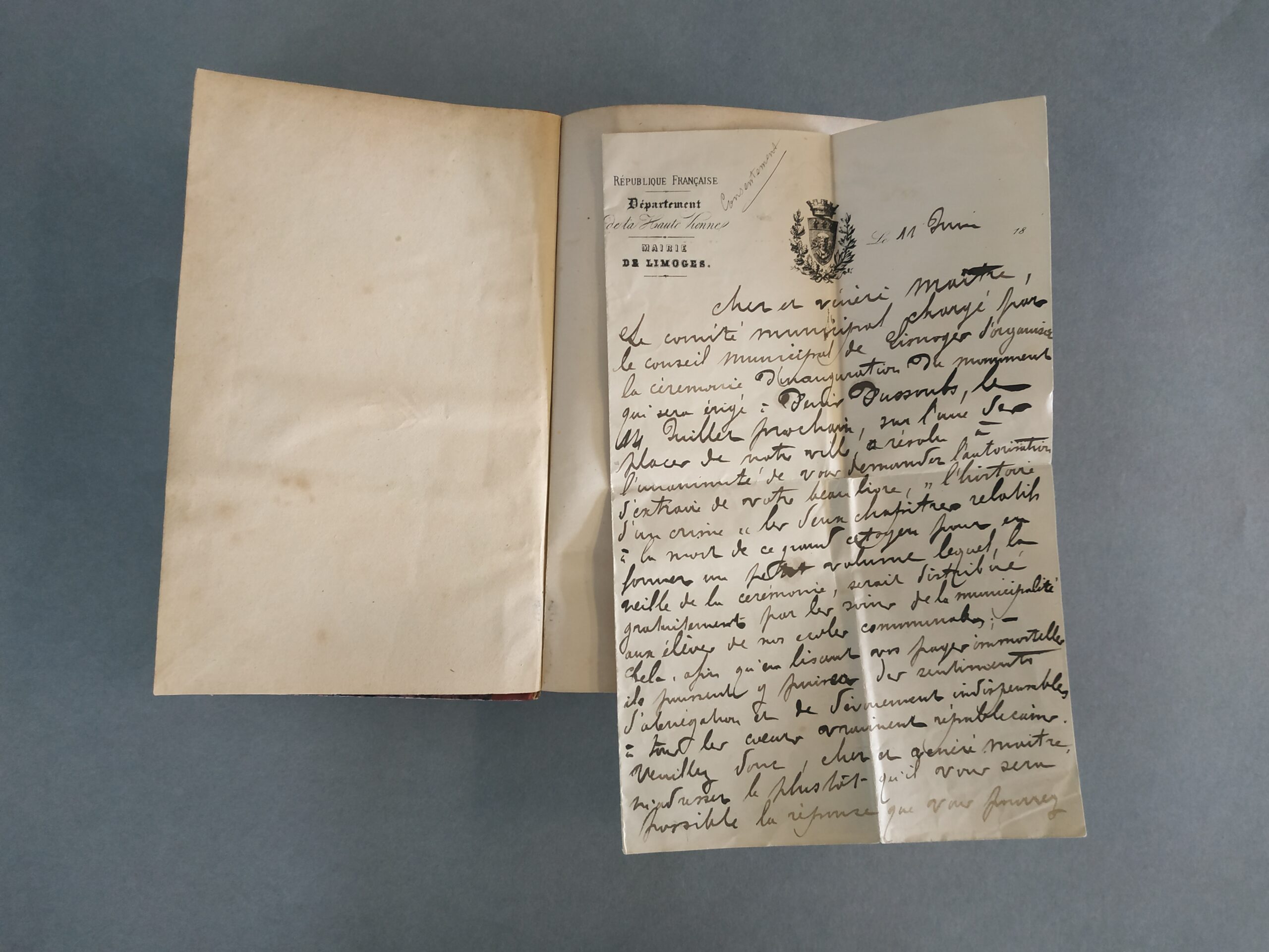 À travers le second ouvrage,Histoire d’un crime : déposition d’un témoin, Hugo, en historien dramaturge, met en scène les quatre journées du coup d’Etat de décembre 1851, signant l’arrêt de mort de la République. Si l’ouvrage ne se caractérise pas cette fois par sa rareté, il se distingue cependant par un autographe de V. Hugo collé en page de garde, autorisant la mairie de Limoges à exploiter un extrait de son livre relatif à Denis Dussoubs, en hommage au député républicain tué sur les barricades.