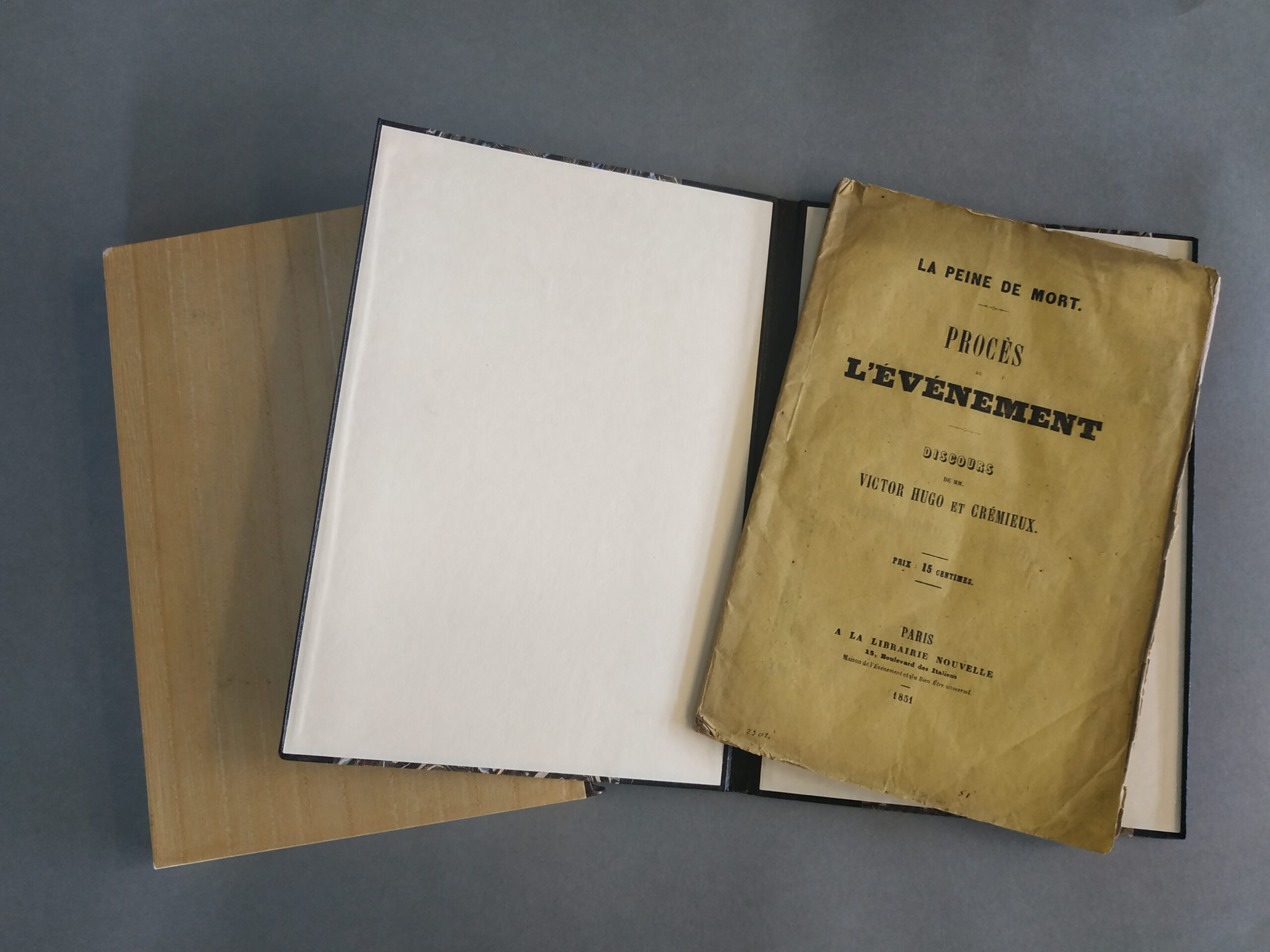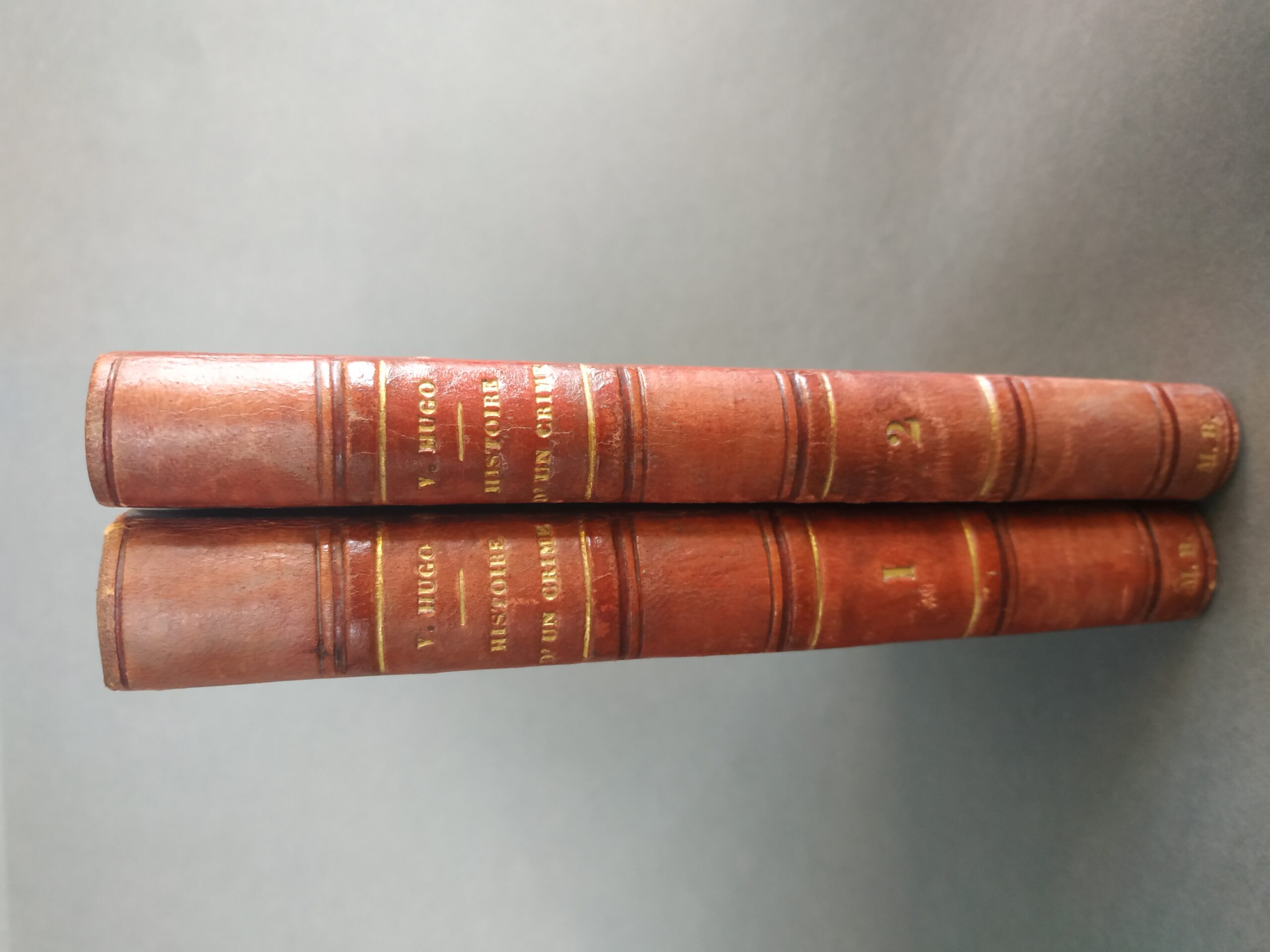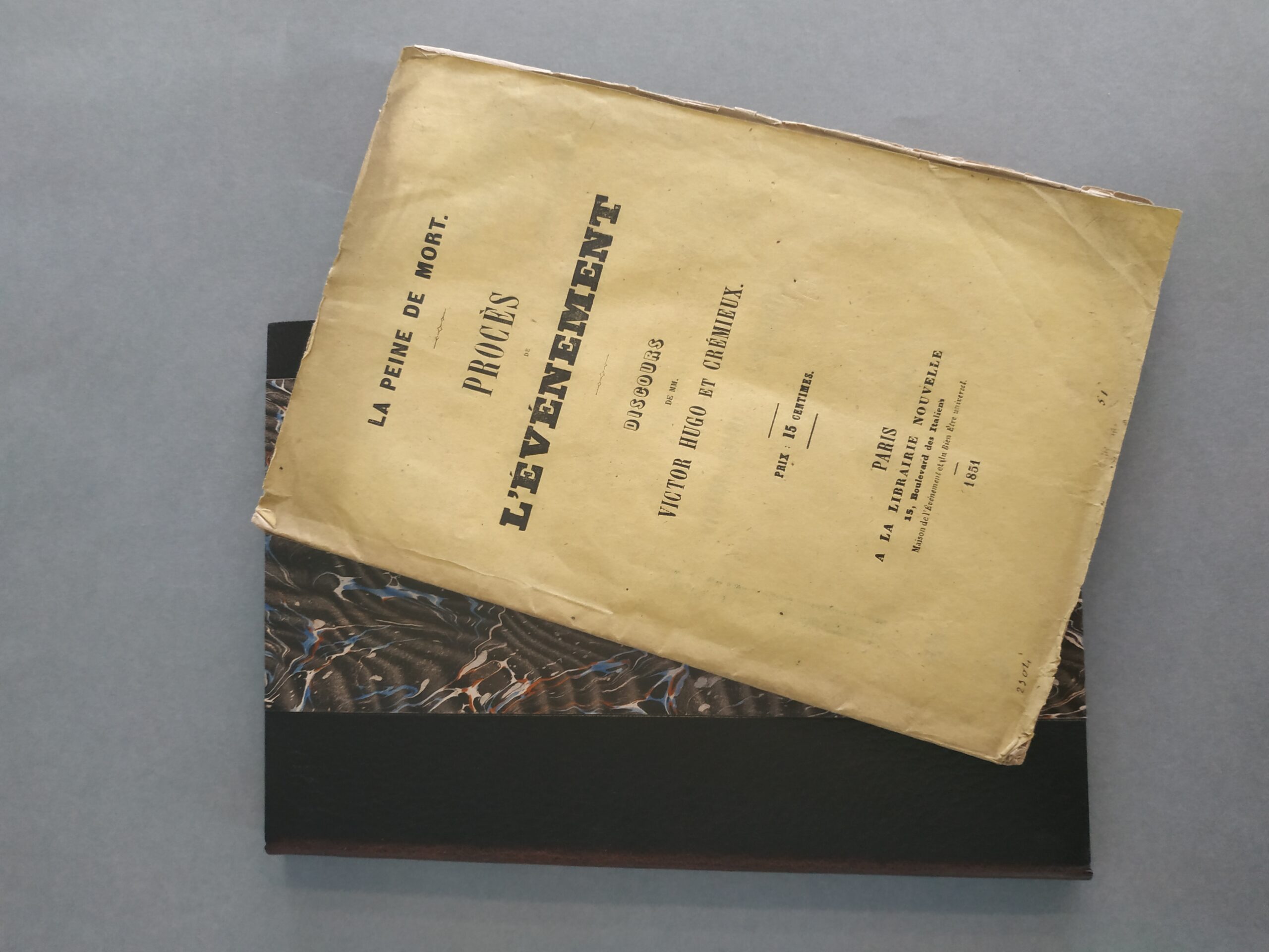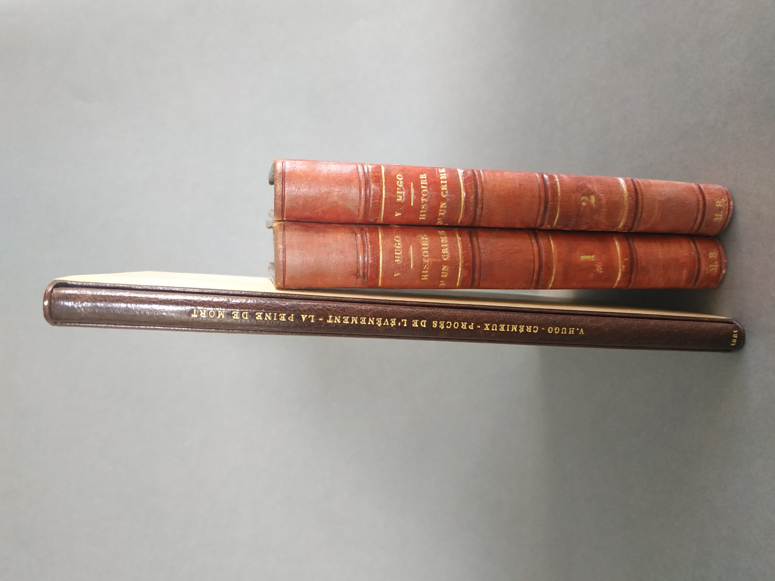 Hugo (Victor), La peine de mort. Procès de « L’Evènement ». Discours de MM. Victor Hugo et Crémieux. [Cour d’assises de la Seine, 11 juin 1851], Paris, Librairie nouvelle, 1851, II-48 p., in-8, plaquette brochée, étui de demi-maroquin moderne. Cote : BH 5839 Hugo, Victor, Histoire d’un crime, 8e éd., Paris, Calmann Lévy, 1877-1878, 2 vol., (304 ; 301 p.), in-12, broché, demi-basane de l’époque. Cote : BH 5836.