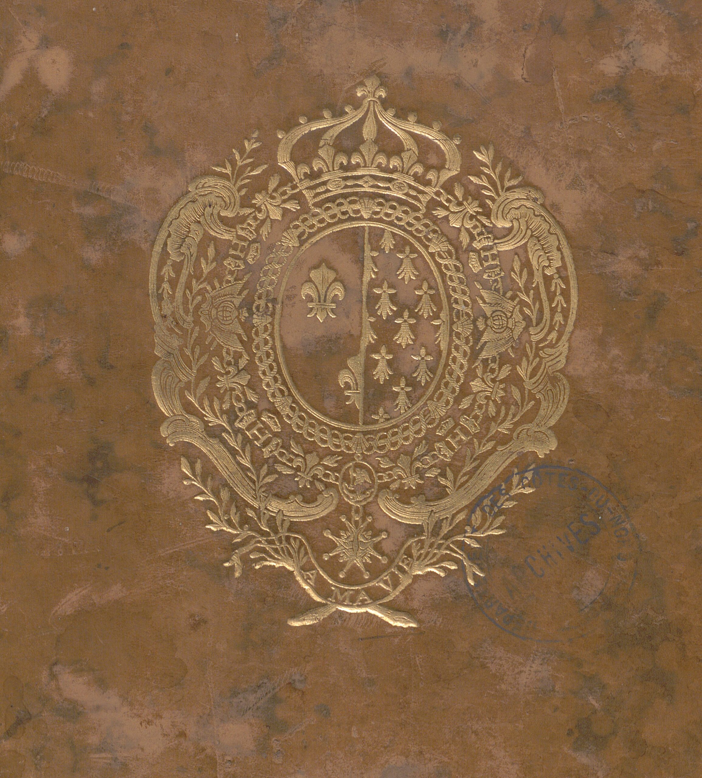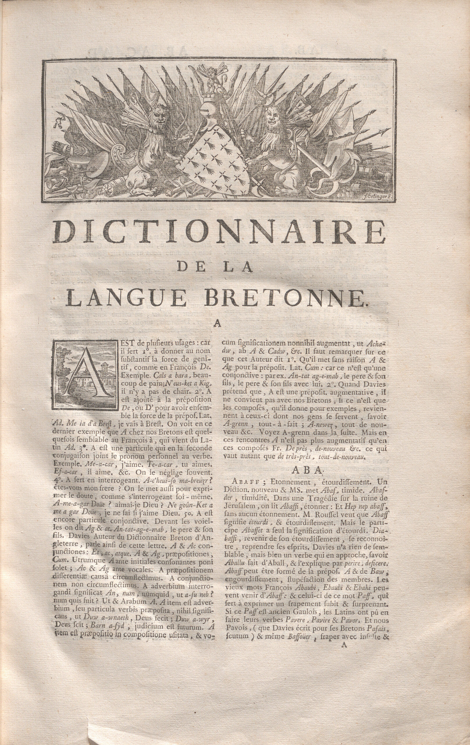 L’exemplaire de son dictionnaire présenté ici est relié en veau marbré et doré aux armes de la duchesse Anne de Bretagne : « Parti d’azur à trois fleurs de lys et d’hermines ». Sur la première page, se trouve une gravure signée F. Ertinger : il pourrait s’agir du graveur à l’eau forte François ou Frantz Ertinger (1640-1710). Cet en-tête est souvent utilisé dans les ouvrages publiés au XVIIIe siècle en Bretagne. Il représente la puissance de la province bretonne par la mise en avant de ses armoiries. Celles-ci sont soutenues par deux grands lions symbolisant le pouvoir et surmontées d’un heaume dont le cimier est un lion assis. L’ensemble s’insère dans un décor militaire composé de multiples objets, comme un faisceau représentant le pouvoir (des bannières), la marine (ancre) et les arts de la guerre (des armes).