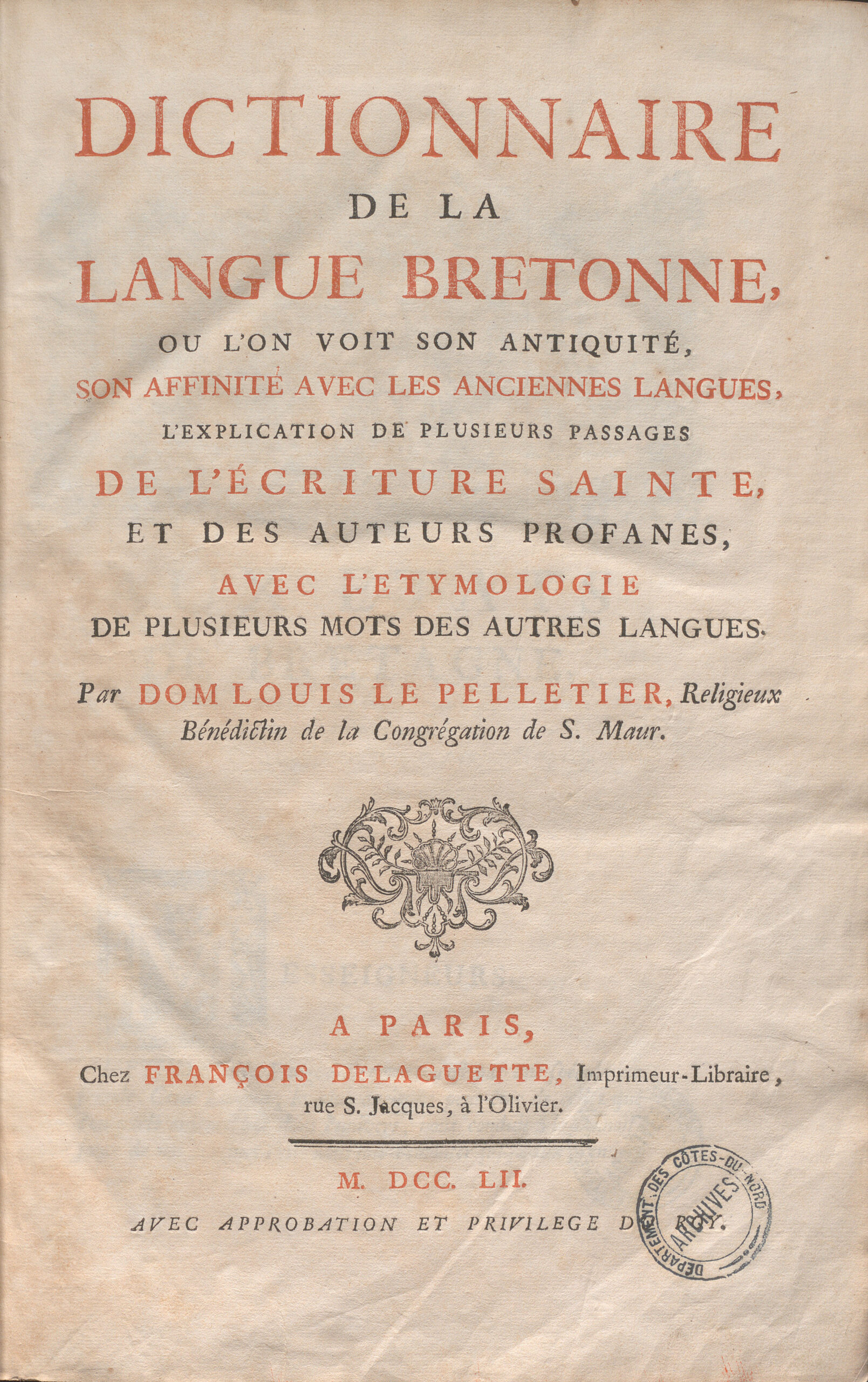 Le Pelletier (Dom Louis), Dictionnaire de la langue bretonne, Paris, François Delaguette éditeur, 1752. Cote : 14 Bi 222.