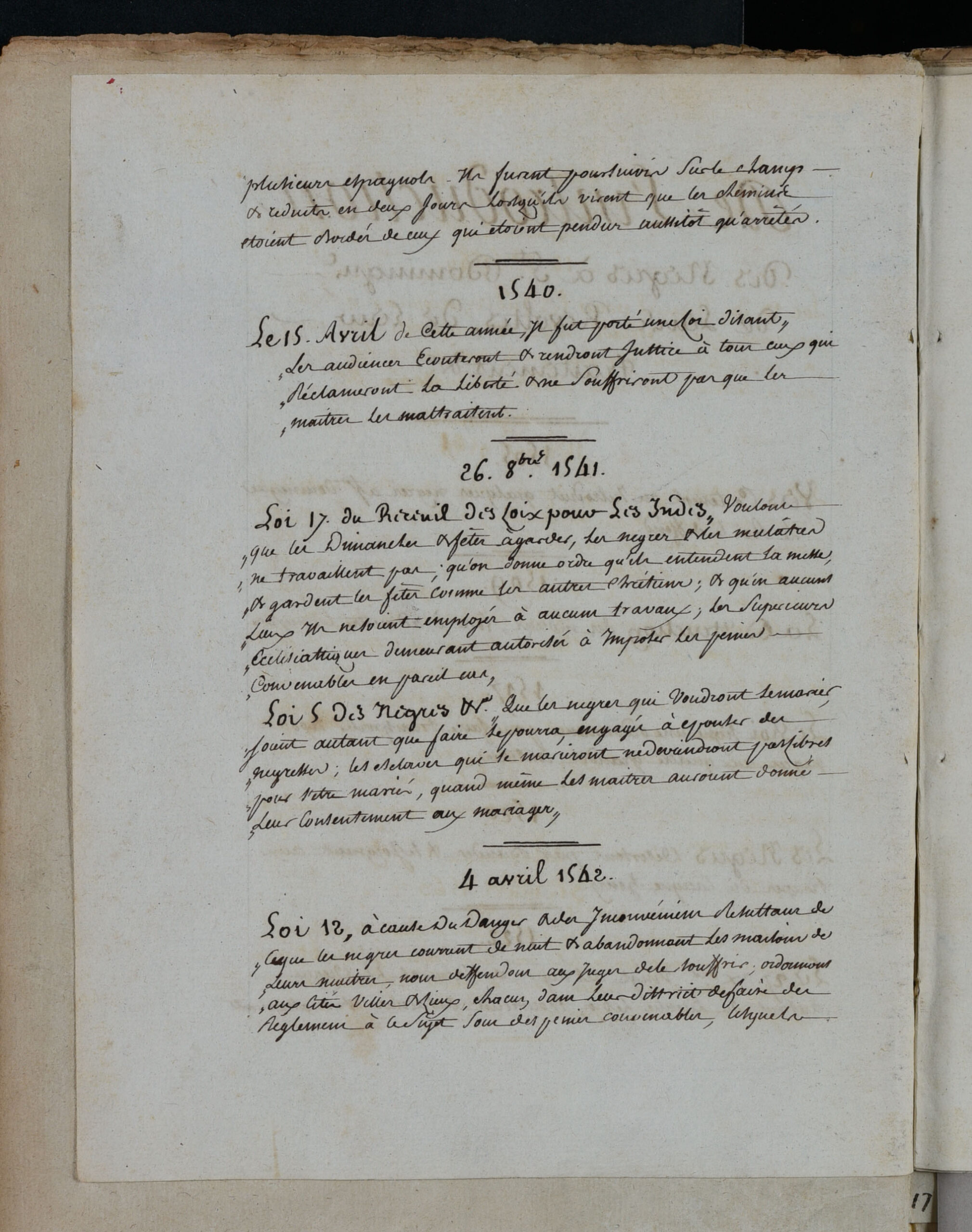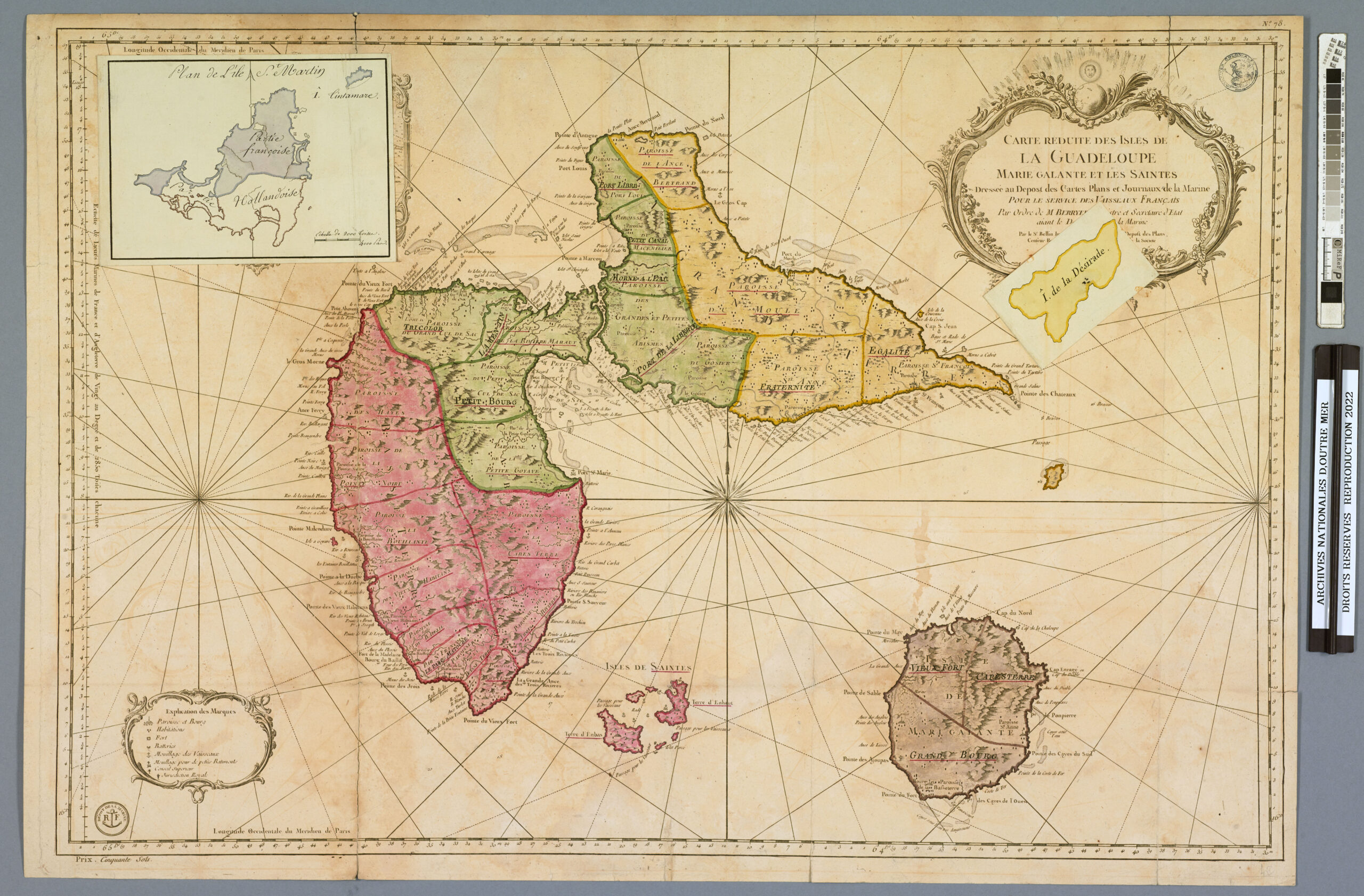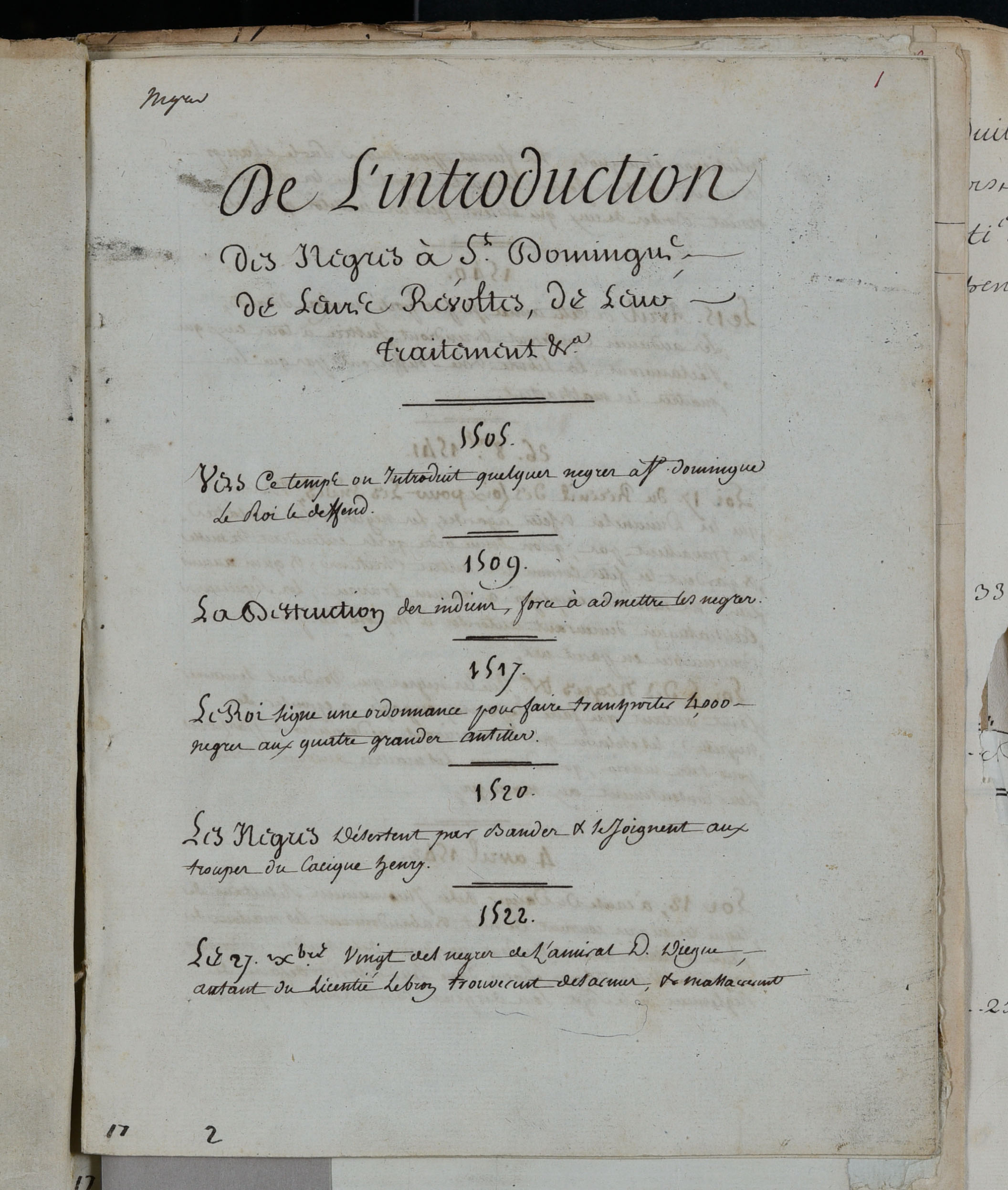 La bibliothèque, la collection et l’atlas Moreau de Saint-Méry à Aix-en-Provence Légendes associées : 1. Armoire de la Bibliothèque de Moreau de Saint-Méry aux Archives nationales d’outre-mer. 2. Volum de la bibliothèque de Moreau de Saint-Méry. FR ANOM BM 75. 3-6. De l’introduction des nègres à Saint-Domingue de leurs révoltes, de leur traitement, etc. Manuscrit à l’encre noire sur papier de la collection Moreau de Saint-Méry. FR ANOM COL F3 94, F° 1 à 4. 7. Carte réduite des îles de la Guadeloupe, Marie-Galante et des Sainte. Carte de l’atlas Moreau de Saint-Méry. FR ANOM F3 288
