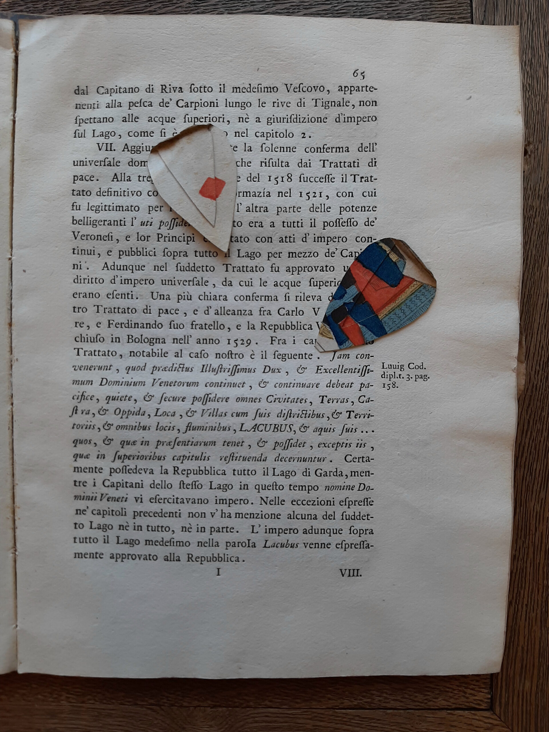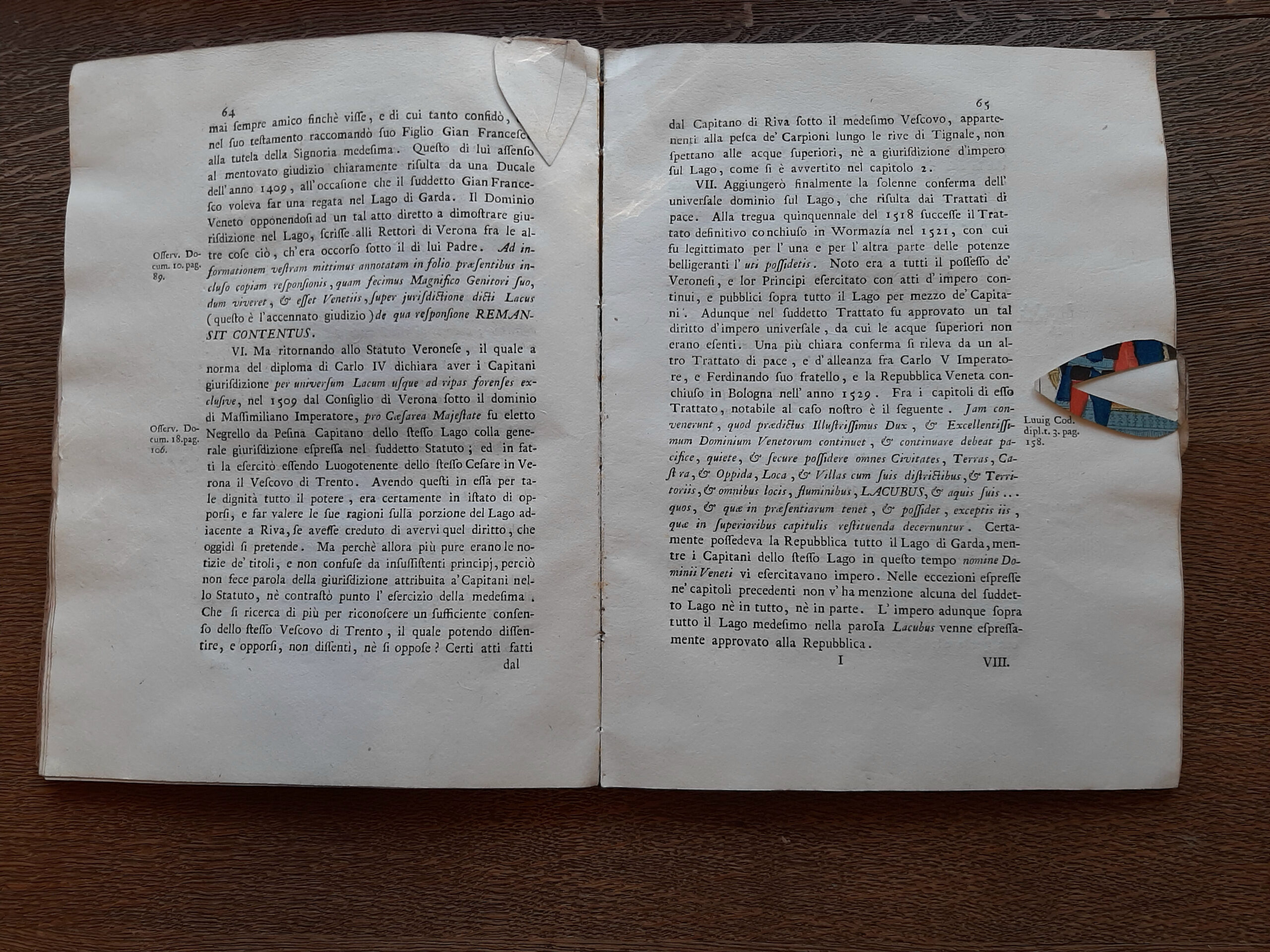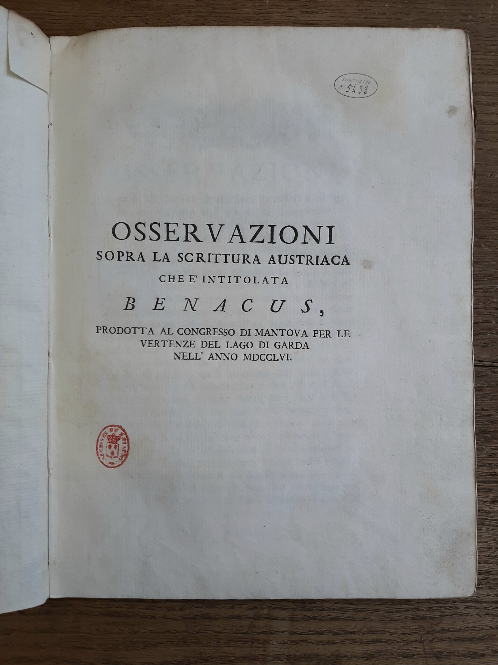 Il s’agit en effet de deux textes datés de 1756, relatifs à un conflit de frontière sur le lac de Garde impliquant l’Autriche et la république de Venise. Les documents qui y sont transcrits – chapitres de traités de paix, lettres ducales… sont destinés à faire valoir les arguments de l’Italie en faveur de cette revendication territoriale. Deux opuscules intitulés Benacus et Deduzione sopra i confini del lago di Garda, qui font valoir, eux, la position de la partie adverse, précèdent immédiatement ces textes. Si la bibliothèque des Archives nationales ne les conserve pas, on les trouve numérisés par des bibliothèques des pays concernés (Allemagne, Autriche) et par la bibliothèque nationale de la République tchèque. Tous illustrent bien le rôle historiquement tenu par les archives en matière de droit des rois et des États, et le lien entre les imprimés et les fonds.