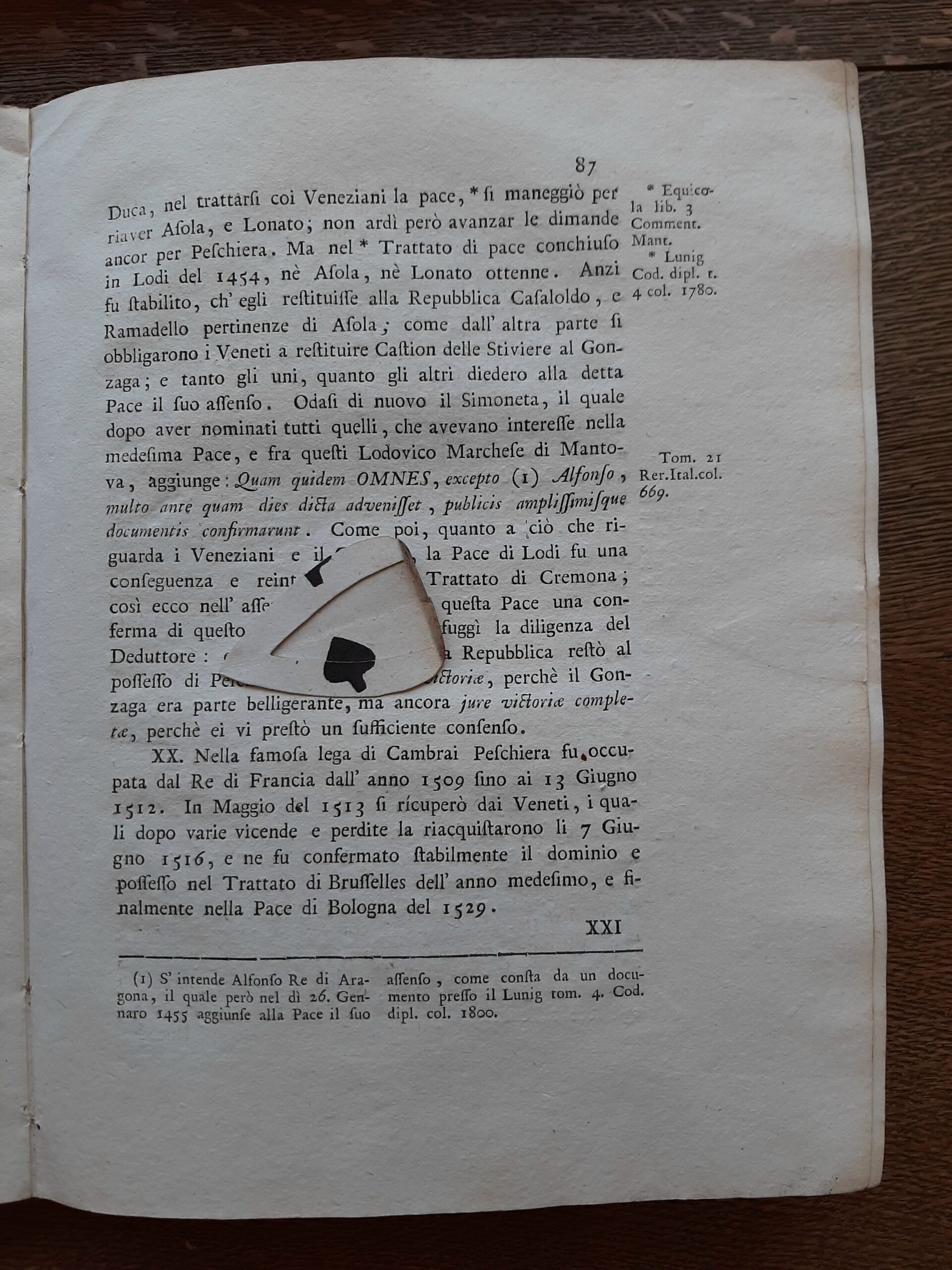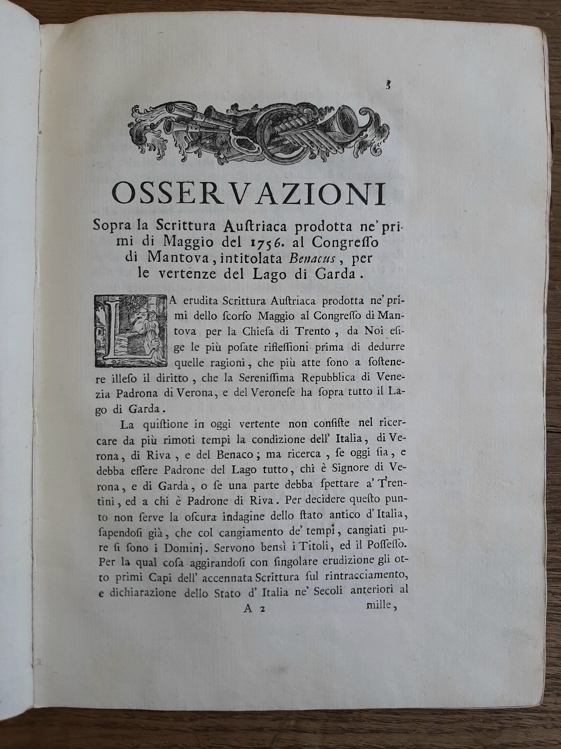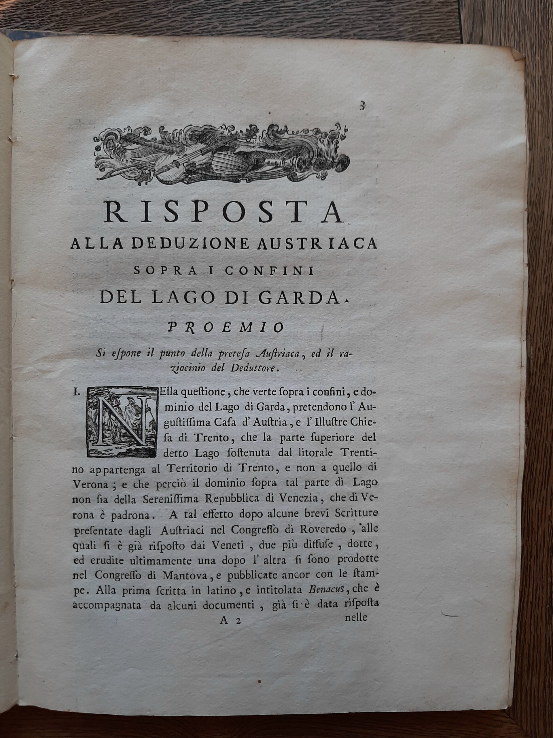 Il s’agit en effet de deux textes datés de 1756, relatifs à un conflit de frontière sur le lac de Garde impliquant l’Autriche et la république de Venise. Les documents qui y sont transcrits – chapitres de traités de paix, lettres ducales… sont destinés à faire valoir les arguments de l’Italie en faveur de cette revendication territoriale. Deux opuscules intitulés Benacus et Deduzione sopra i confini del lago di Garda, qui font valoir, eux, la position de la partie adverse, précèdent immédiatement ces textes. Si la bibliothèque des Archives nationales ne les conserve pas, on les trouve numérisés par des bibliothèques des pays concernés (Allemagne, Autriche) et par la bibliothèque nationale de la République tchèque. Tous illustrent bien le rôle historiquement tenu par les archives en matière de droit des rois et des États, et le lien entre les imprimés et les fonds.
