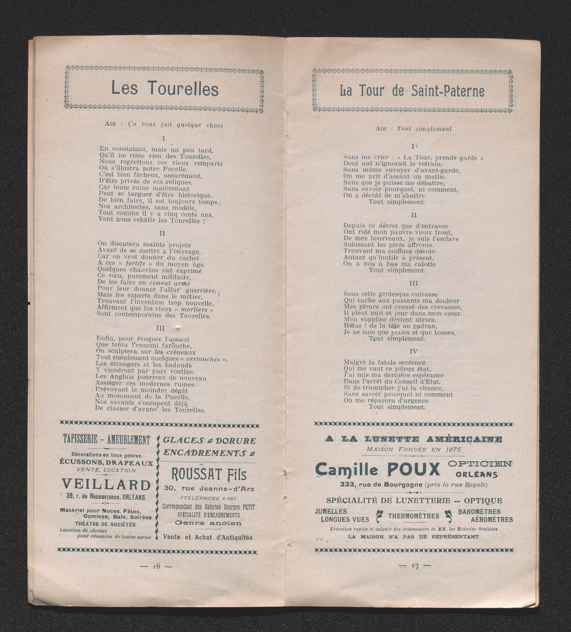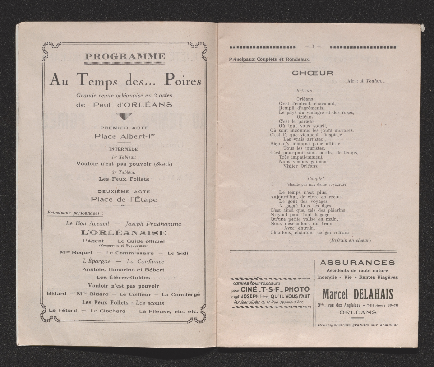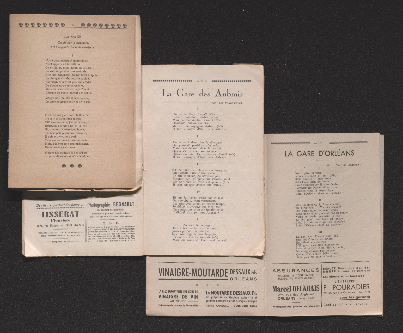 Ces neuf revues de spectacles orléanais proviennent soit d’un achat auprès d’un libraire de Blois en 2002, soit de don de particuliers. Leur collection est malheureusement lacunaire. Une étude approfondie de ces textes mériterait d’être menée en s’appuyant sur les archives.